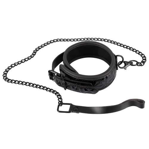 Черный шейный браслет с легкой набивкой от Bad Kitty с рельефной отделкой, выполненный с использованием бриллиантовой огранки. Края окаймлены. В комплект входит матово-черный цепной поводок с карабином и ремешком на запястье, общая длина 88 см. Шейный ремешок шириной 5,5 см, регулируемый по окружности от 40 до 48 см.