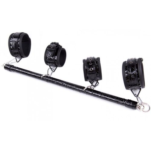 Распорка для фиксации БДСМ с наручниками и оковами из искусственной кожи черного цвета DS Fetish
