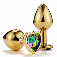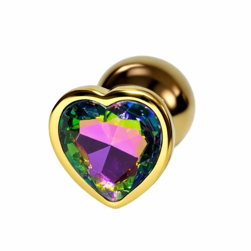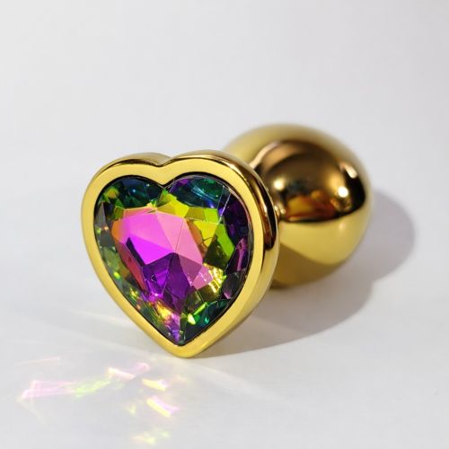 Анальная пробка ALUME, M, металлическая золотистая с разноцветным камнем в форме сердца, 8,5 × 3,3 см