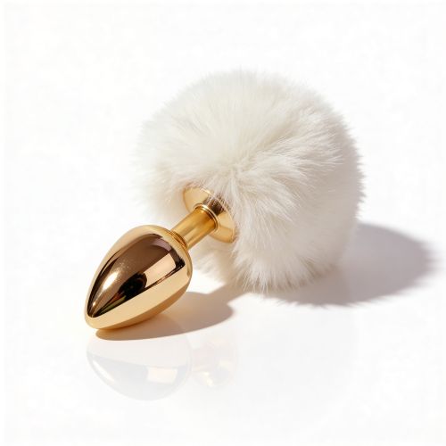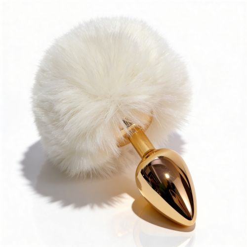 Анальная пробка небольшого размера с металлической вставной частью конической формы и заостренным кончиком. Корпус имеет глянцевую золотистую поверхность с зеркальным блеском. Форма сужается к вершине для постепенного введения. Основа выполнена как большая пушистая декоративная часть из густого светлого пуха с легким блеском. Пух объемный, кремово-белый, закреплен на металлическом стержне по центру. Конструкция сочетает жесткую металлическую часть и мягкую декоративную основу.