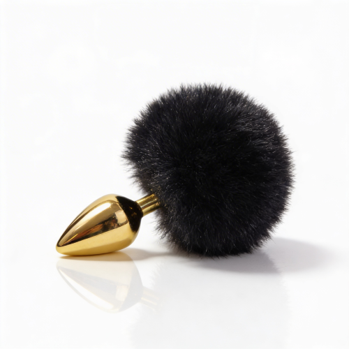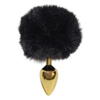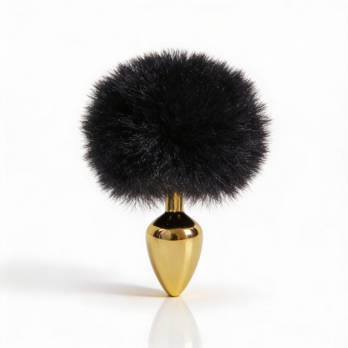 Анальная пробка небольшого размера с металлической вставной частью конической формы и заостренным кончиком. Корпус имеет глянцевую золотистую поверхность с зеркальным блеском. Форма сужается к вершине для постепенного введения. Основа выполнена как большая пушистая декоративная часть из густого черного пуха с легким блеском. Пух объемный, черный, закреплен на металлическом стержне по центру. Конструкция сочетает жесткую металлическую часть и мягкую декоративную основу.