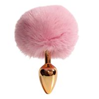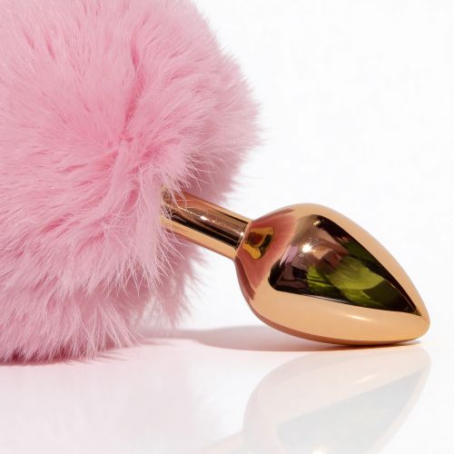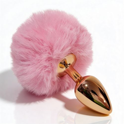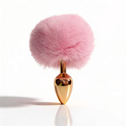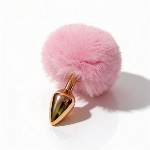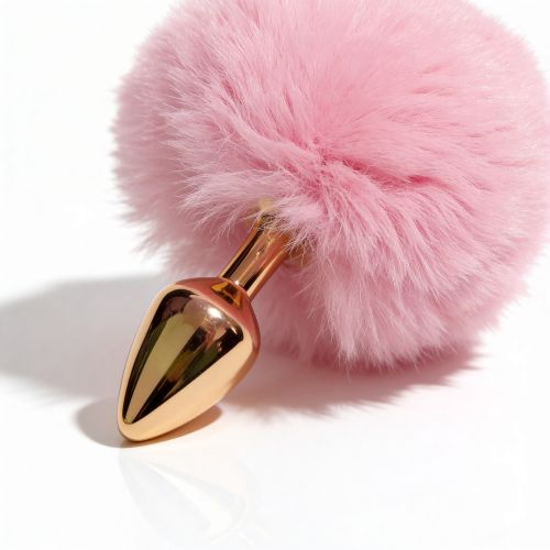 Анальная пробка небольшого размера с металлической вставной частью конической формы и заостренным кончиком. Корпус имеет глянцевую золотистую поверхность с зеркальным блеском. Форма сужается к вершине для постепенного введения. Основа выполнена как большая пушистая декоративная часть из густого розового пуха с легким блеском. Пух объемный, розовый, закреплен на металлическом стержне по центру. Конструкция сочетает жесткую металлическую часть и мягкую декоративную основу.
