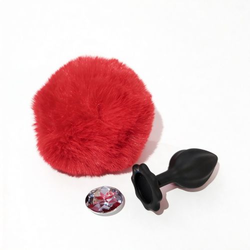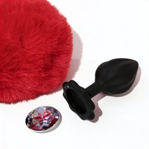 Анальная пробка рельефная ALUME S, черная с красным пушком и сменным прозрачным камнем, 7 × 2,8 см