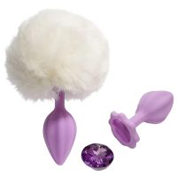 Анальная пробка рельефная ALUME S, лиловая с белым пушком и съемным лиловым камнем, 7 × 2,8 см