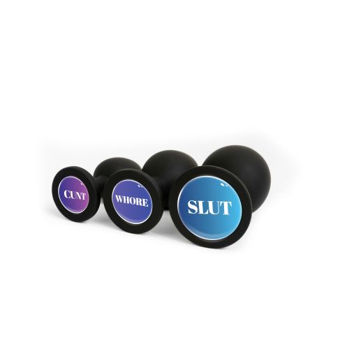 Анальная пробка силиконовая черная с надписью Whore OKOVA размер M