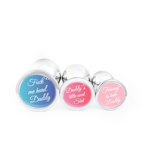 Анальная пробка металлическая серебристая с надписью Fuck me hard Daddy OKOVA размер M