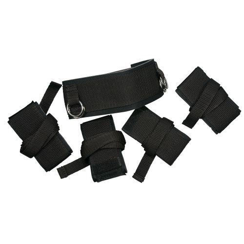 Узкие прочные ремешки соединяют манжеты на запястьях и щиколотках с шейным воротником. Длина бретелей 132 см, если они не отрегулированы. Вы можете либо создать полностью вертикальное положение тела, либо отрегулировать ремни, чтобы получить кривое положение. Обе руки могут быть индивидуально отрегулированы. Все манжеты застегиваются на липучки. Материал: полипропилен, хромированный металл, полиуретан, полиэстер.