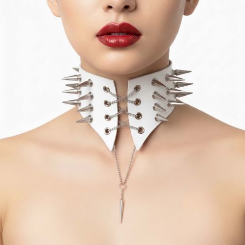 Боковые шипы добавляют агрессии и характера — это деталь, которая работает с любого ракурса. Спереди — провокационная шнуровка на цепях. Переплетение металла создает напряжение, усиливает драму и притягивает взгляд к центру композиции. Подвеска добавляет динамики — при движении она ловит свет и усиливает эффект.