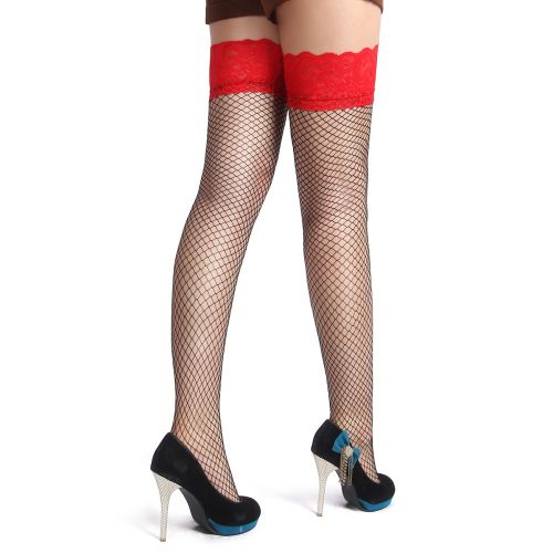 Чулки эротические в сеточку Star Night Fishnets, черные с красным кружевом