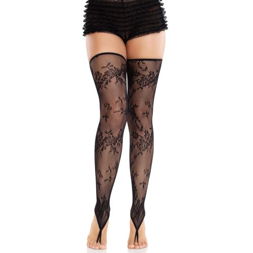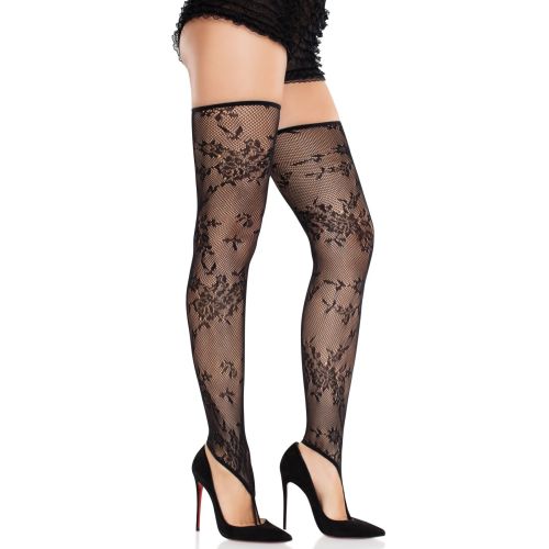 Чулки без носка с петелькой с цветочным принтом и сеткой черного цвета Leg Avenue размер One Size