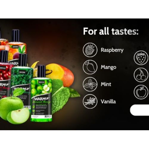 Превратите обычный массаж в наслаждение всех чувств: ощущений, вкуса и аромата. Съедобое массажное масло JOY Division WARMup со свежим яблочным ароматом радует не только кожу, но и нос, обеспечивая целостное эстетическое удовольствие.