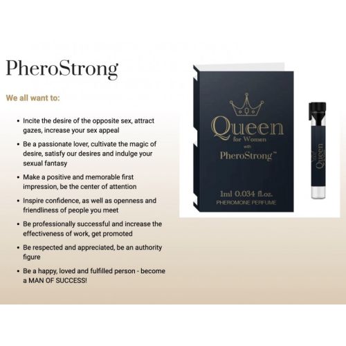 Женские духи с феромонами для возбуждения мужчин. Мы все хотим: Разжигать желание противоположного пола, привлекать взгляды, повышать свою сексуальную привлекательность. Будь страстным любовником, культивируй магию желания, удовлетворяй наши желания и предавайся своей сексуальной фантазии. Произведите положительное и запоминающееся первое впечатление, будьте в центре внимания. Внушайте доверие, а также открытость и дружелюбие людей, которых вы встречаете. Будь профессионально успешен и повышай эффективность работы, получай повышение. Пользуйтесь уважением и признательностью, будьте авторитетной фигурой. Будь счастливым, любимым и состоявшимся человеком - стань МУЖЧИНОЙ УСПЕХА!Верхняя нота: Юдзу, плод граната. Нота сердца: пион, магнолия, лотос. Базовая нота: Мускус, Амбра, Древесина. Чувственный, кристально чистый, чудесно сверкающий. Свежий и шипучий аромат для чувственной, уверенной в себе и всегда эффектной женщины. PheroStrong pheromone Queen for Women - это мягкий цветочный аромат с фруктовыми и мускусными акцентами. Верхняя нота - сочетание фруктов граната с ледяным аккордом и цитрусовыми нотами юдзу. Нота сердца - легкий цветочный букет из магнолии, пиона и цветка лотоса. Базовая нота состоит из мускуса, амбры и дерева акажу, создающих чувственную вуаль аромата.PheroStrong - химия любви обретает новый смысл. Феромоны используются для усиления эротического влечения и даже для лечения нарушений сексуального влечения и возбуждения, - говорит профессор Збигнев Лев-Старович, - и вызывают: чувство желания, влюблённость, увеличивают ваши шансы на оргазм. Результаты исследований, проведенных с феромонами, показывают, что мы можем контролировать нашу сексуальность и связанное с ней поведение. Феромоны PheroStrong сделают вас неотразимой для противоположного пола. Они позволят вам сломать барьер застенчивости и увеличат ваши шансы на флирт. Они помогут вам быть открытым, уверенным в себе и общительным человеком. Станьте центром внимания - PheroStrong поможет вам развить магнетическую индивидуальность.Эта сексуальная приманка также поможет вам разжечь страсть и желание в вашей спальне. Они помогут разрешить, раскрыть и возродить страсть. Феромоны повышают уровень возбуждения и снимают смущение. Больше открытости даст вам обоим новые интенсивные ощущения.Феромоны работают в самых разных отношениях, например, мужчина-женщина, мужчина-мужчина или женщина-женщина. Они влияют на наши гормоны, а также на альфа-ритм мозга и нейротрансмиттеры. Поэтому они часто используются между людьми одного пола в профессиональной сфере, на работе, в деловой среде. Вы хотите улучшить свои деловые отношения? Повысить эффективность? Иметь лучшую производительность на работе? Выступить положительно на собеседовании? PheroStrong может помочь вам завоевать доверие друзей и деловых партнеров и завоевать доверие. Это также может улучшить вашу устойчивость к стрессу, так что вы можете получить больше уверенности и уважения со стороны вашего оппонента, сидящего по другую сторону стола. Феромоны также могут помочь вам произвести хорошее первое впечатление. Они могут расширить ваши возможности, привлечь интерес, вы станете более авторитетным человеком и, следовательно, более эффективным!Осознанно управляйте своим имиджем! PheroStrong может помочь вам утвердить свой авторитет в качес