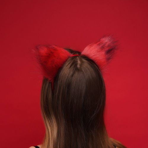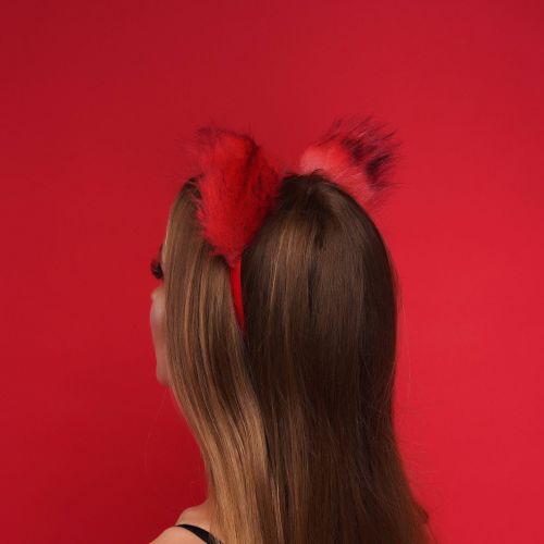 Меховые ушки кошечки с бантиком для ролевых игр Красные с черным Okova