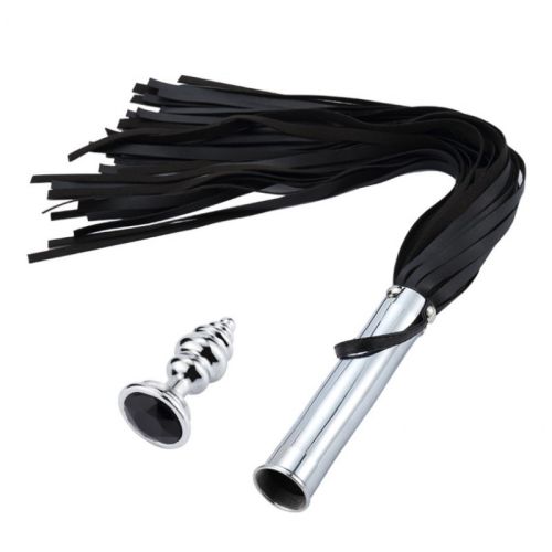 Комплект анальная металлическая пробка серебристого цвета с камешком черного цвета соединенная с кнутом Bdsm4u Anal Plug Combination
