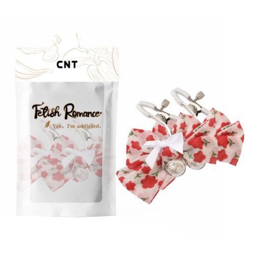 Зажимы для сосков БДСМ с силиконовыми наконечниками и белыми бантиками и красным узором Cnt