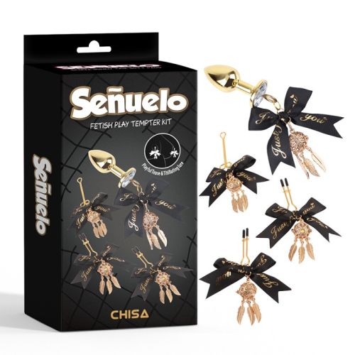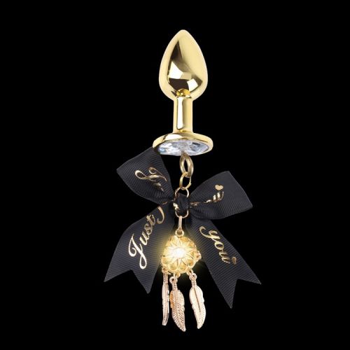 Анальная пробка с серебристым камушком и зажимами для сосков с бантиками металлические золотистого цвета Chisa