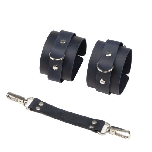 Наручники соединяются кожаным ремешком на двух карабинах, который легко отстегивается, и наручники можно использовать в качестве браслетов.