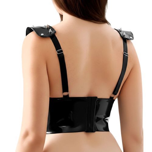 Эффектный виниловый топ Mistress создан для смелых образов и уверенного самовыражения. Глубокий V-образный вырез подчеркивает линию декольте, а плотная посадка формирует выразительный силуэт. Декоративные металлические шипы на чашках и плечах придают модели характер и делают ее акцентной деталью образа.