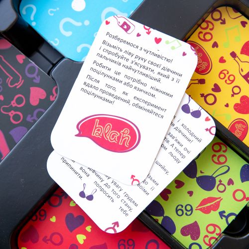 Игра состоит из 4х уровней: «Разговоры», «Ласки», «Прелюдии», «Секс». Вы плавно перемещаетесь с одного уровня на другой, тем самым растягиваете удовольствие и узнаете очень много нового друг о друге.
