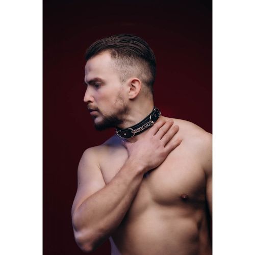 Ошейник мужской с цепями и поводком БДСМ натуральная кожа черного цвета Candy Hero модель M Ch4