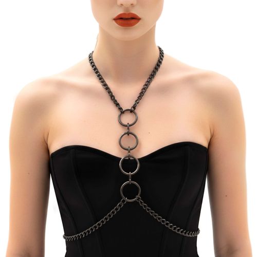 Конструкция мягко ложится по контуру, обрамляя зону декольте и подчеркивая талию. Центральные кольца усиливают драматичность образа и добавляют нотку доминирования. В движении цепи красиво перекликаются с телом, создавая игру света и притягательную динамику.