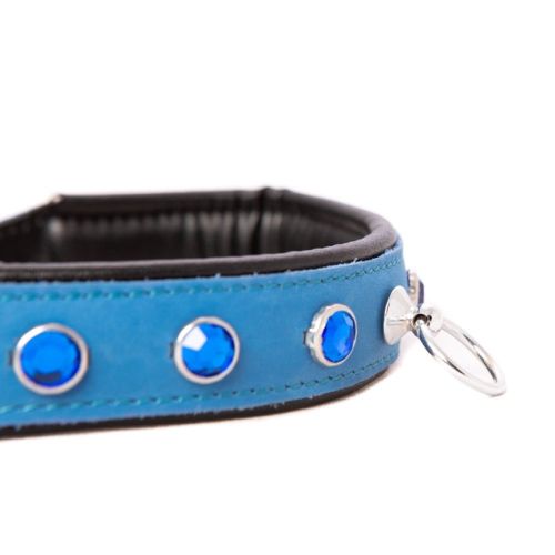 Ошейник со стразами тонкий DS Fetish кожаный, голубой (Голландия)