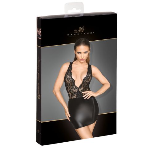 Верх платья выполнен из тонкого кружева с цветочным мотивом. Глубокое декольте приковывает внимание к груди, акцентирует, манит. Вырез на спине придает еще большей сексуальности, тянет оставить сотни поцелуев и прикосновений, а завязки выглядят соблазнительно, ведь их так и хочется развязать. Внизу платье состоит полностью из винила. Оно обтягивает, демонстрирует изгибы талии и бедер. Сзади так же находится молния, которая подчеркивает сочные ягодицы.