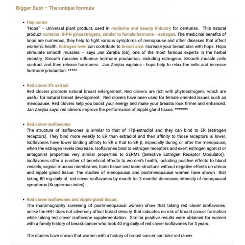 Bigger Bust – это препарат, влияющий на размер женского бюста. Эффективность препарата подтверждают 91% женщин, принимающих капсулы. Эффект препарата виден до 8 недель в 89% случаев, при этом у 52% женщин поражение было заметно через 4 недели после начала лечения. Среднее время ожидания эффекта составляет 3, 8 недели. Количество капсул, принимаемых каждый день, влияет на эффективность лечения. Длительность лечения влияет на эффекты препарата. Чем дольше женщина применяет лекарство, тем лучше она становится.Большая, упругая, стройная грудь: привлекает внимание, может быть источником гордости, доставлять удовольствие, заставляет женщин выглядеть лучше, возбуждает мужчин, делает женщин более сексуальными и привлекательна.Инновационная процедура Большой бюст в пределах досягаемости! Большой бюст – увеличенная, упругая и подтянутая грудь. Лечение добавками признано одним из безоперационных методов увеличения груди.Как работают добавки? Капсулы содержат тщательно отобранные растительные экстракты, в состав которых входят фитоэстрогены, соединения, сходные с женскими гормонами человека. Они отвечают за естественный рост железистой ткани и производство новых клеток, которые делают грудь более упругой. Для лучшего эффекта комбинируйте добавку Bigger Bust и сыворотку Bigger Bust.Bigger Bust – пищевая добавка, содержащая активные ингредиенты на основе фитоэстрогенов, которые делают вашу грудь больше и упругой.Фитоэстрогены действуют так же, как и эндогенные эстрогены, однако не имеют побочных эффектов. женские гормоны могут быть. Вот почему их можно использовать женщинам, переживающим менопаузу, особенно когда ЗГТ (заместительная гормональная терапия) не рекомендуется.Как применять? По 1 капсуле 3 раза в день, запивая водой. ВНИМАНИЕ. Не превышайте рекомендуемую дозу 3 капсулы в день. Используя одновременно 2 метода: капсулы с их натуральными компонентами, которые работают изнутри, и сыворотку, которая воздействует непосредственно на вашу грудь, вы сможете получить наилучшие результаты за короткое время.Косметические продукты, которые предназначены для улучшения упругости и внешнего вида кожи груди. Они обычно содержат специальные активные ингредиенты, которые могут способствовать укреплению тканей и повышению тонуса кожи. Важно отметить, что кремы для подтяжки груди не могут радикально изменить форму или размер груди, и их действие обычно является временным. Некоторые из активных ингредиентов, которые могут присутствовать в кремах для подтяжки груди, включают: Коллаген: Это белок, который улучшает упругость кожи и ее структуру. Эластин: Другой белок, который способствует поддержанию упругости и эластичности кожи. Растительные экстракты: Могут быть добавлены экстракты растений, таких как алоэ вера, зеленый чай, витамин Е, которые обладают увлажняющими свойствами и способствуют обновлению кожи. Гиалуроновая кислота: Увлажняет и смягчает кожу, придавая ей более гладкое и упругое ощущение. Ретинол: Витамин А, который может помочь уменьшить появление морщин и улучшить общее состояние кожи. При выборе крема для подтяжки груди важно учитывать свой тип кожи, возраст, аллергии на составляющие и другие индивидуальные особенности. Кроме использования кремов, подтяжку и укрепление груди можно достичь также с помощью упражнений для грудной мышцы, п