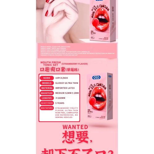 Ультратонкие презервативы с гиалуроновой смазкой OLO из натурального латекса со вкусом клубники.