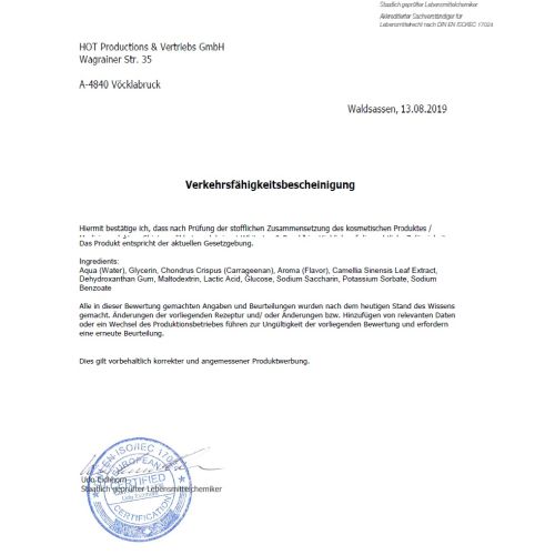 Aqua (Water), Glycerin, Aroma (Flavour), Hydroxyethylcellulose, Sodium Benzoate, Potassium Sorbate, Citric Acid.