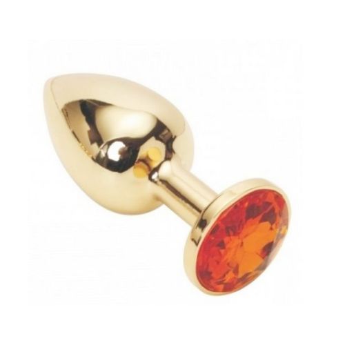 Металлическая анальная пробка золотистая с красным кристаллом SKN размер S