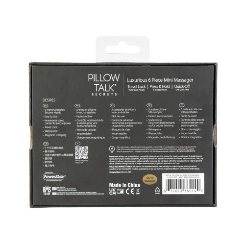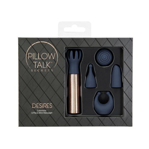 Вибромассажер Ванд золотистого цвета с 5 синими насадками Pillow Talk Secrets Desires 6 Piece Mini Massager Set Navy