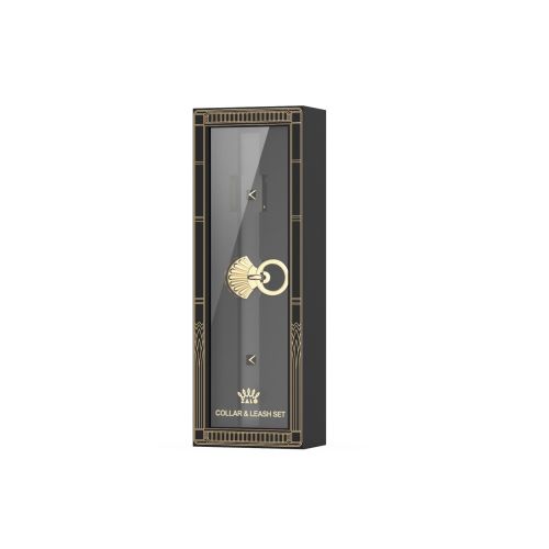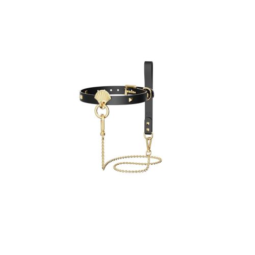 Роскошный ошейник черного цвета БДСМ с поводком цепочкой и фурнитурой золотистого цвета Zalo