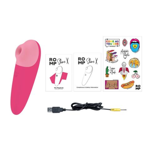 Комплектация: вакуумный клиторальный стимулятор Romp Shine, USB-кабель для зарядки (адаптер переменного тока не входит в комплект), краткое руководство и инструкции по безопасности.