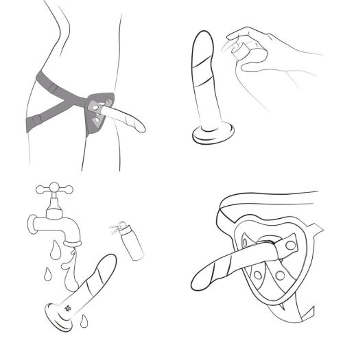 Встановіть страпон на тіло за допомогою ремінців, підігнавши їх під свій розмір. Нанесіть на страпон невелику кількість змазки для зручності введення.Догляд за ремінним страпоном