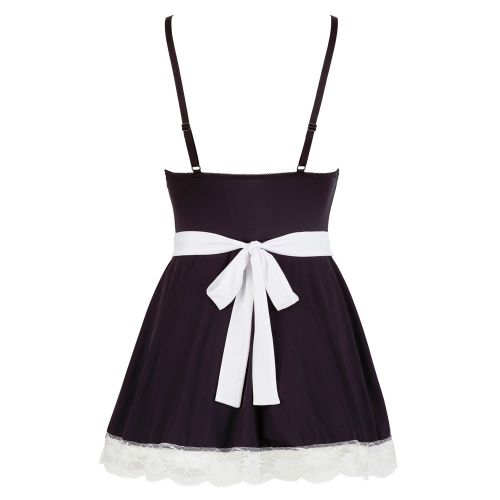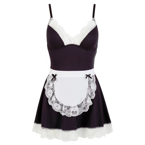 Облягаюча міні-сукня з регульованими бретелями. Злегка розкльошена спідниця та біле мереживо по подолу та вирізу. У комплект входить фартух з мереживом та декоративним бантом для зав'язування.