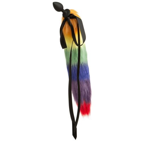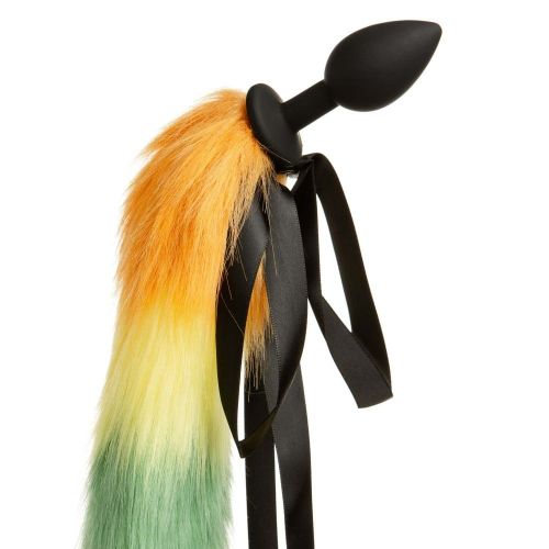 Анальна пробка силіконова чорного кольору з різнокольоровим хвостом та стрічкою Loveshop