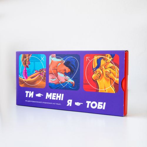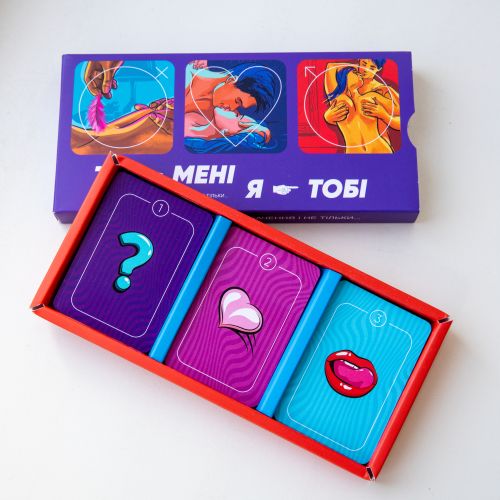 Гаряча Новинка! Якщо ви зібралися на побачення, гарно одягнулися, купили еротичну білизну і обов'язково одягли панчохи! Замовили столик у ресторані - вам не вистачає всього однієї деталі - це гра Ти - мені, я - тобі. Гра стане пікантним і цікавим продовженням вашого вечора, ви зможете грайливо почати флірт або приступите до найголовнішого в ігровій формі. Гра знахідка для тих хто хоче натякнути на першому побаченні про сексуальні бажання. Якщо ви не знаєте з чого почати - довіртеся грі, з нею у вас буде маса варіантів, що робити наодинці. Так само гра стане гарною прелюдією для супер сексу! Перший гравець повинен виконати завдання, яке випало. Якщо ж випала карта "Ти - Мені", то завдання переходить другому гравцю. І вже він відкриває по черзі карти з колод 2 і 3 і повинен виконати завдання, що випало. Карту з колоди 1 тягнуть завжди по черзі. Якщо щойно тягнув перший гравець, то за ним тягне другий. У наборі три колоди по 30 карток