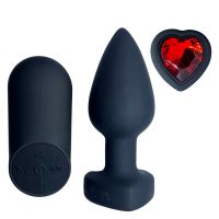Анальна вібропробка чорна з червоним каменем у формі серця та з пультом Passion Play 28 режимів