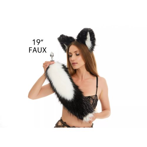 Анальний хутряний хвіст без пробки Триколірний Білий чорний чорнобурий з білим кінчиком OKOVA 500 мм