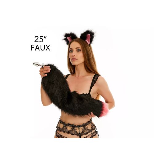 Анальний хутряний пухнастий хвіст без пробки Чорний з яскраво-рожевим кінчиком OKOVA 600 мм