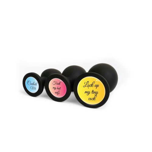 Анальна пробка силіконова чорна з написом Lock up my tiny Cock OKOVA розмір S