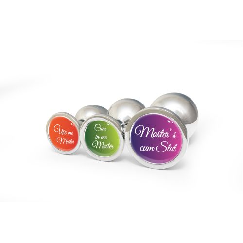 Анальна пробка металева срібляста з написом Cum in me Master OKOVA розмір L