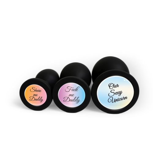 Анальна пробка металева срібляста з написом Our sexy Unicorn OKOVA розмір M