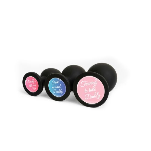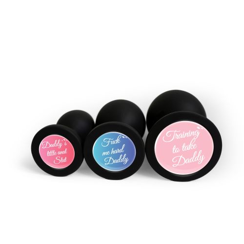 Анальна пробка силіконова чорна з написом Training to take Daddy OKOVA розмір L