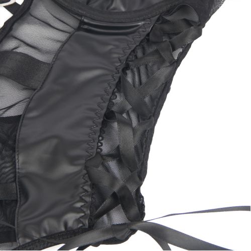 Чорний колір надає образу пристрасті та стилю, а відкрита спинка і сіточка відкривають простір для фантазії, залишаючи місце інтризі. Ідеальний крій підкреслює вигини, а продуманий доступ перетворює модель на ідеальне поєднання естетики та пристрасті.