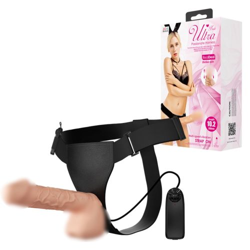 Ременний вібрострапон реалістичного тілесного кольору з чорними трусиками та пультом ДУ Lybaile Ultra Passionate Harness Strap On RealDeal довжина 260 мм