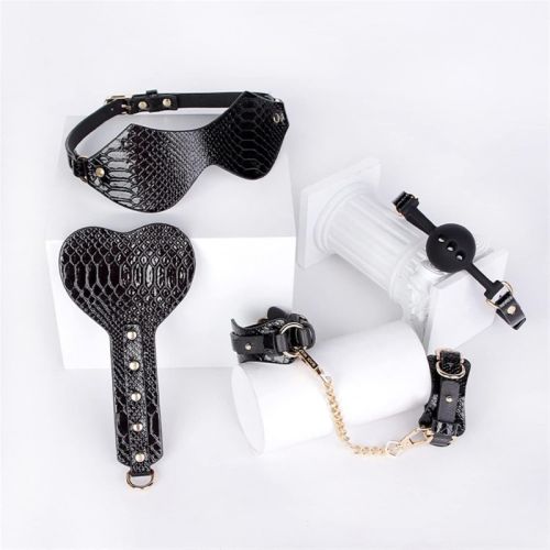 Набір аксесуарів для БДСМ у стилі крокодилової шкіри чорного кольору Vscnovelty Crocodile Grain Bondage Kit 7 предметів