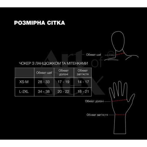 Щіло прилеглий до шиї чокер створює чіткий акцент і надає образу впевненості. Металевий ланцюжок з'єднує його з сітчастими мітенками, додаючи динаміку та легкий елемент провокації. При кожному русі ланцюжок м'яко грає, створюючи живий ефект та притягуючи погляд.