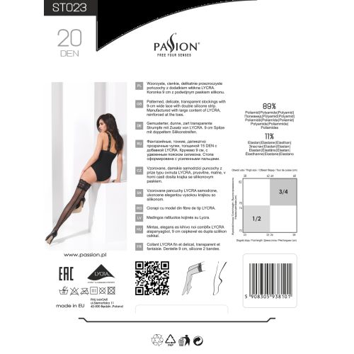 Пропонуємо купити панчохи зі швом виробництва польської компанії Passion. Модель ST023 Nero виконана з якісної європейської сировини з додаванням LYCRA. Чорне Елегантне мереживо з геометричним малюнком прикрашає верхню частину панчіх. Самопідтримуюча гумка шириною 9 см з внутрішньої сторони посилена двома силіконовими стрічками. Завдяки цьому панчохи зі швом відмінно сидять на ніжках і абсолютно не сповзають в процесі носіння. Тому вам не буде потрібно ніяких додаткових аксесуарів.